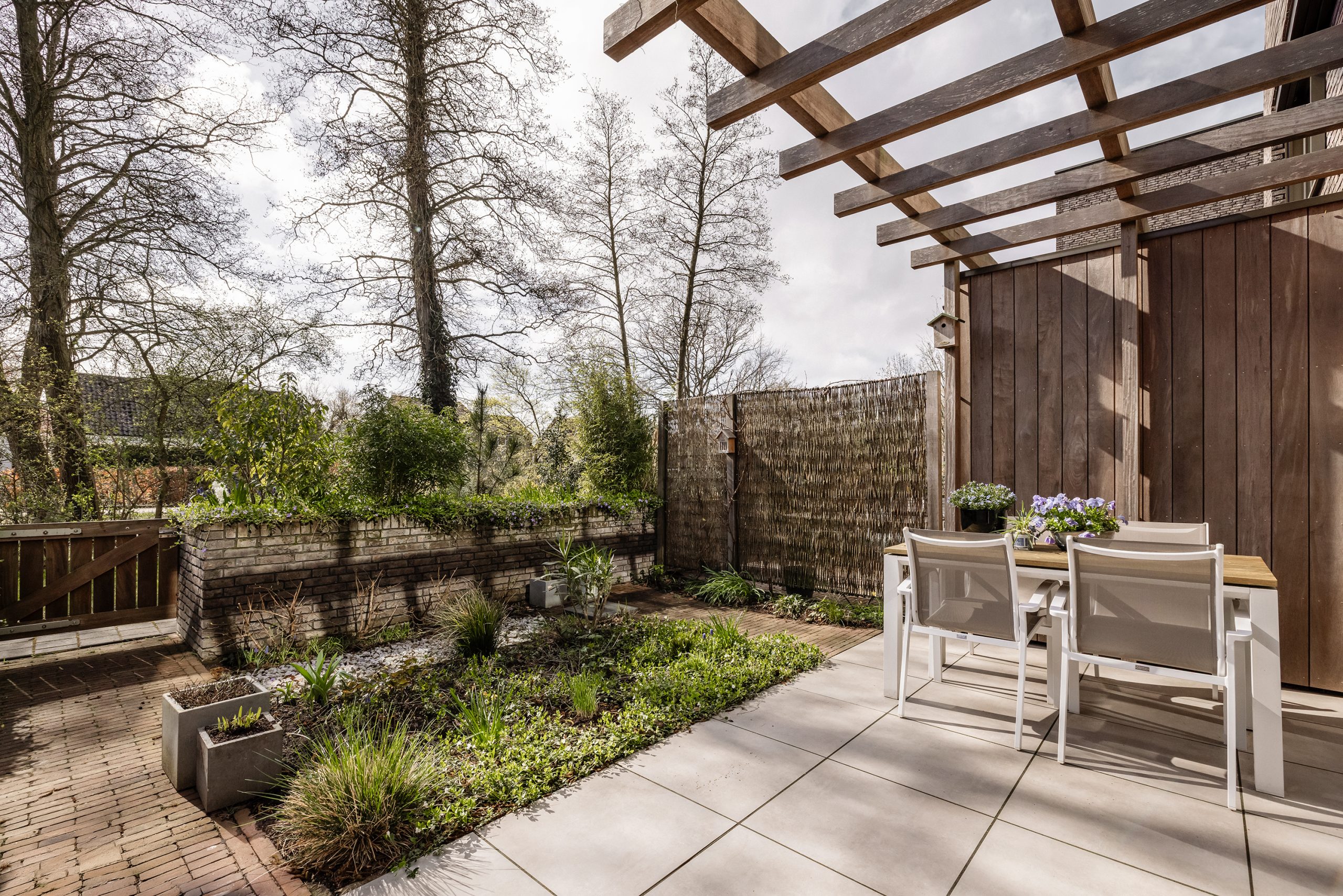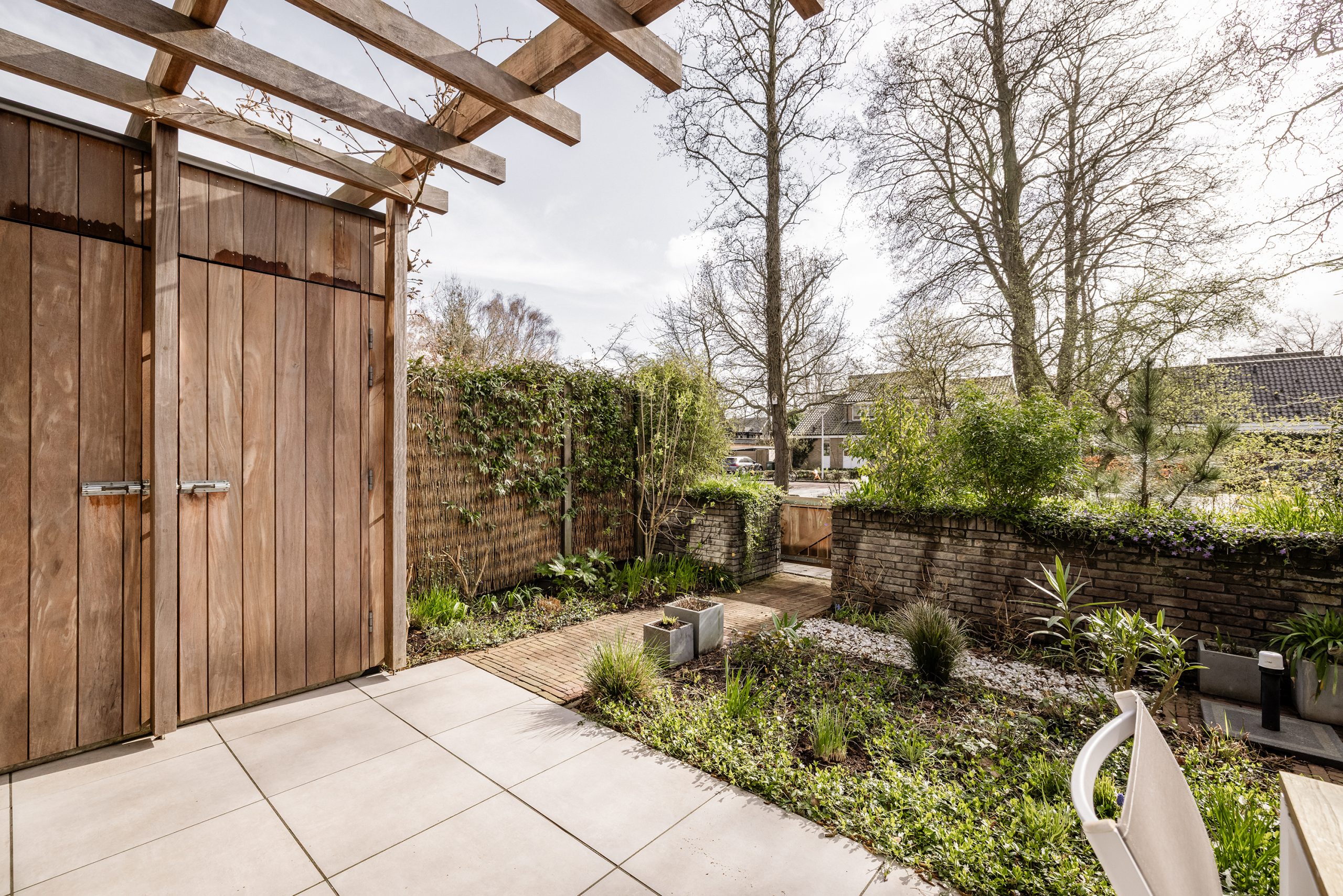 De tuin op het zuidwesten is een waar verlengstuk van de woning. Onder de pergola geniet je van een overdekt terras, perfect voor lange zomeravonden of rustige middagen met uitzicht op het groen. Praktische buitenkasten en een buitenkraan maken het plaatje compleet. Hier woon je in alle rust, maar toch dichtbij alles wat je nodig hebt!