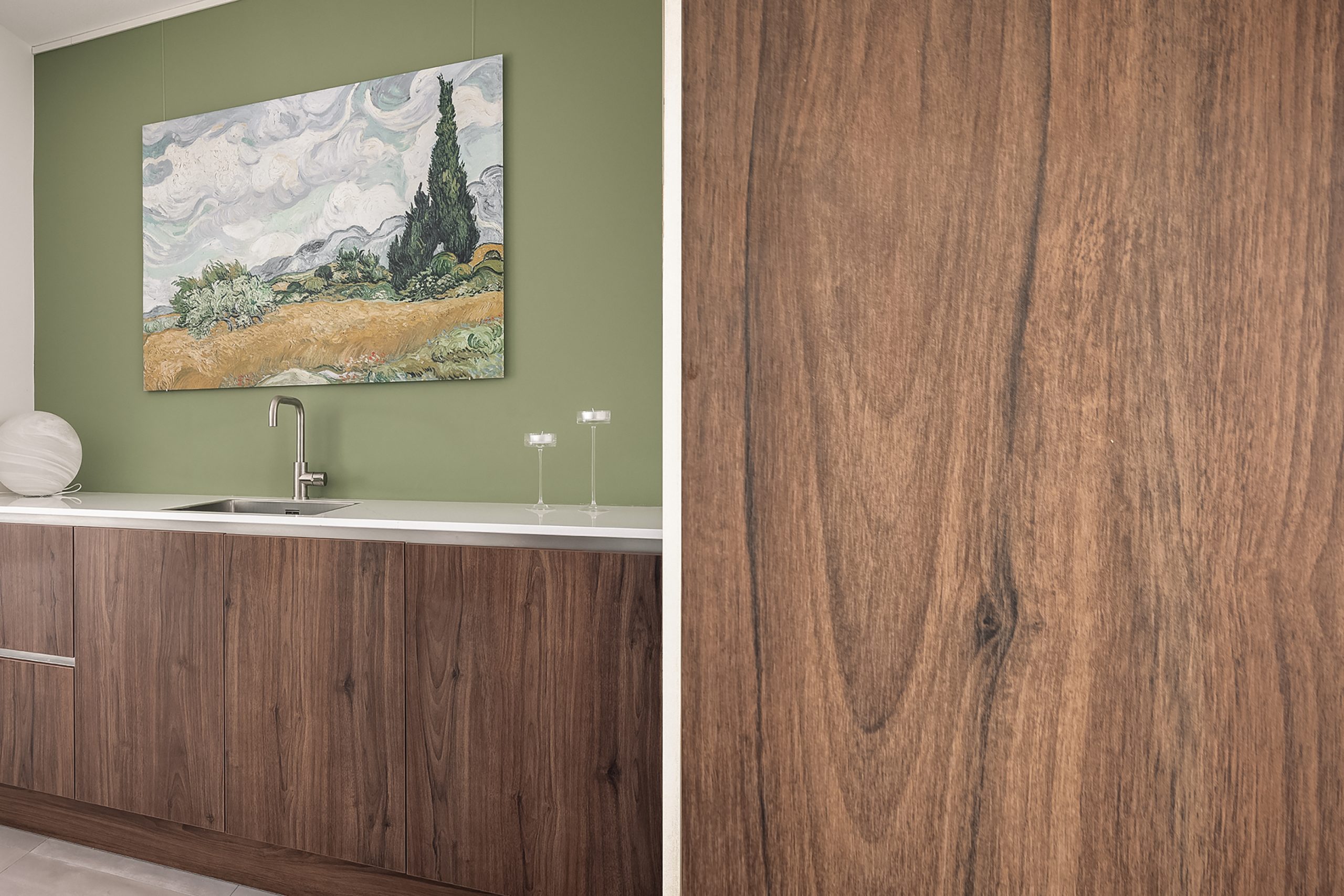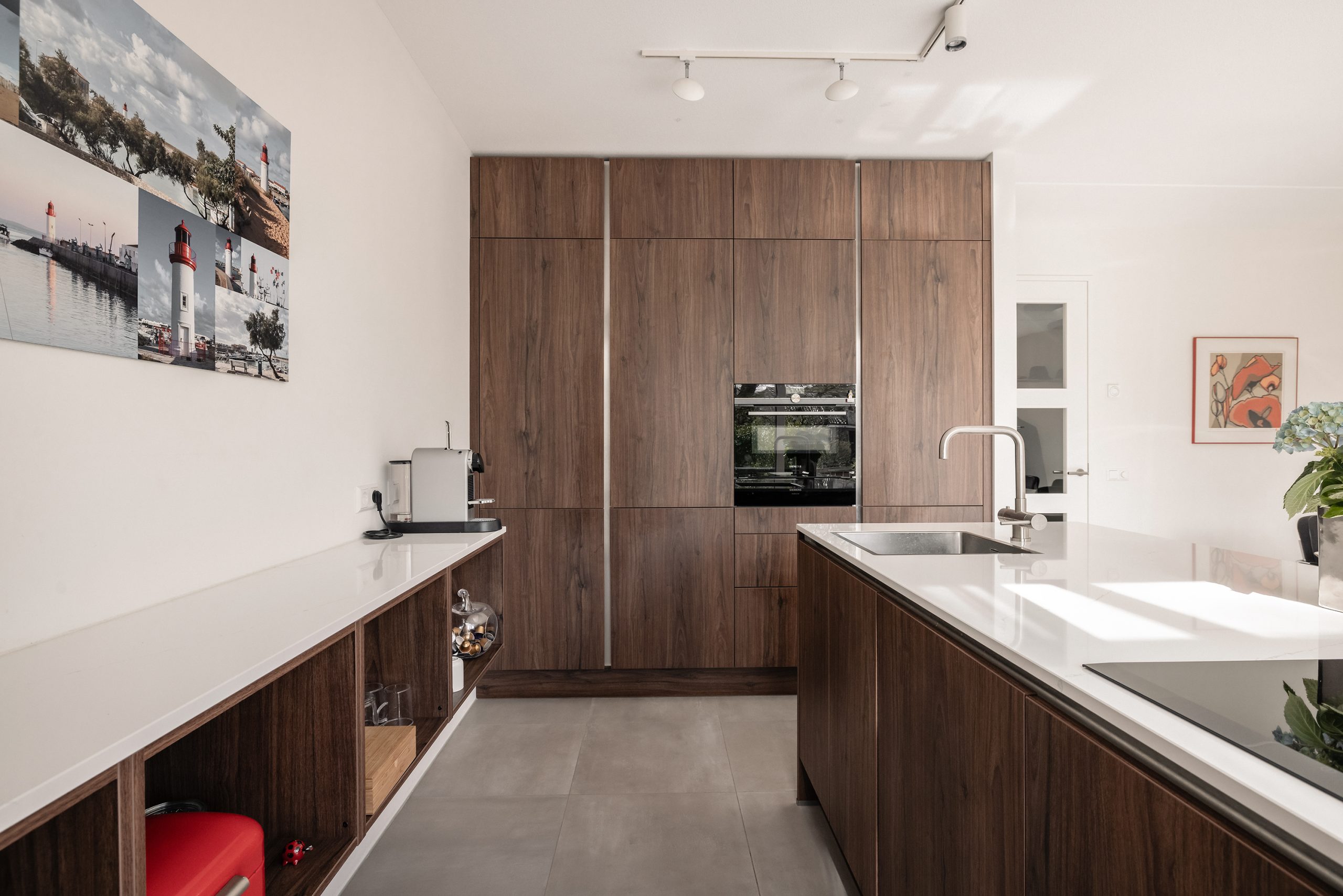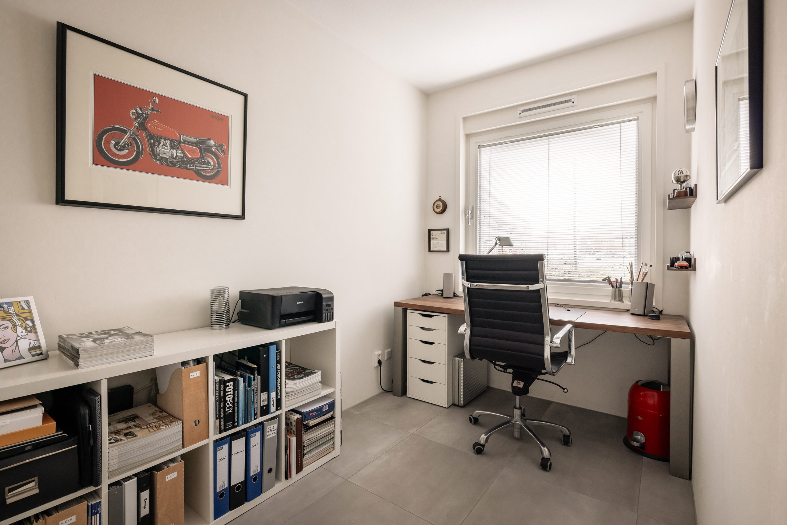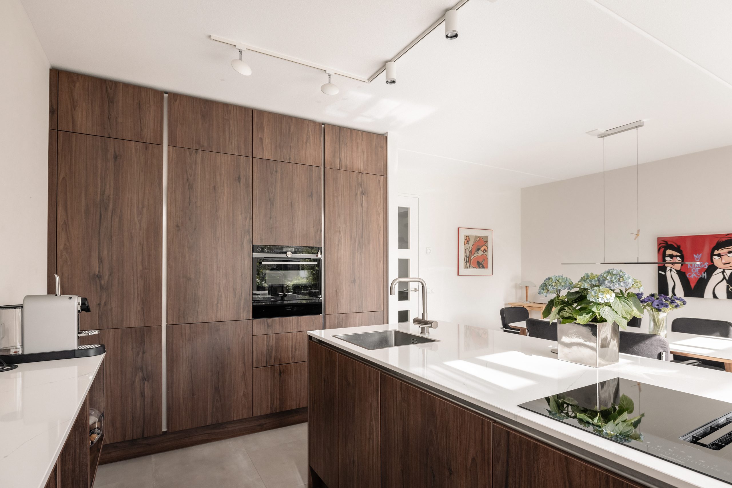 De royale woonkamer van maar liefst 11 bij 6 meter beslaat de volledige etage en baadt in daglicht dankzij de grote raampartijen voor en achter. Twee schuifdeuren openen naar het Franse balkon, waar je ’s ochtends in de zon van je koffie kunt genieten. Slim bedacht: een kitchenette met spoelbak en kleine koelkast, zodat je een drankje of koffie pakt zonder naar beneden te lopen. Deze verdieping ademt luxe, comfort en leefruimte.