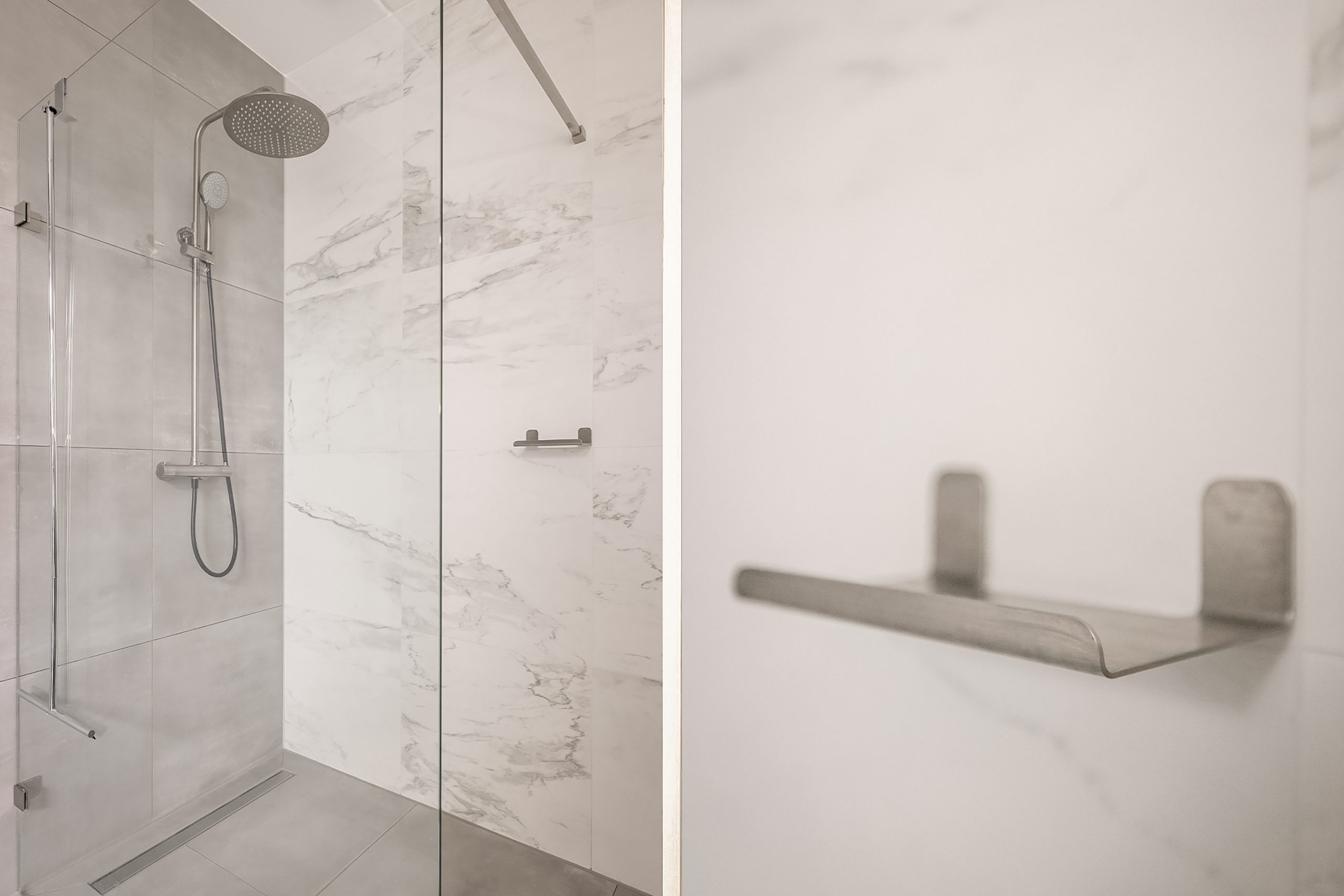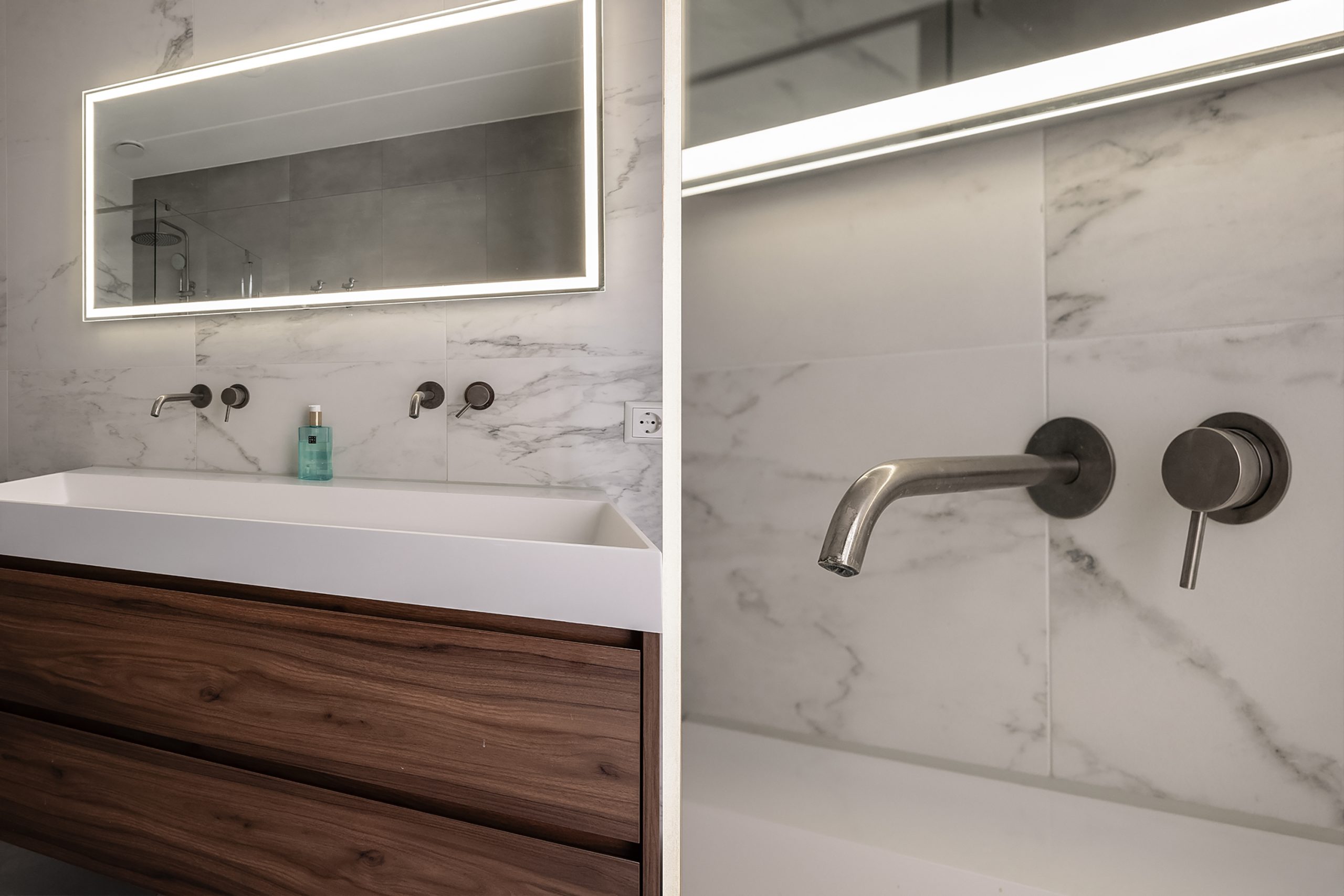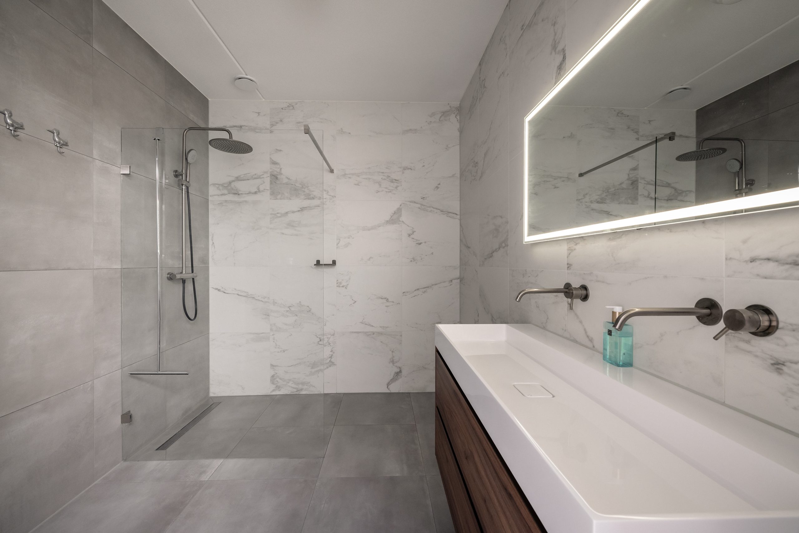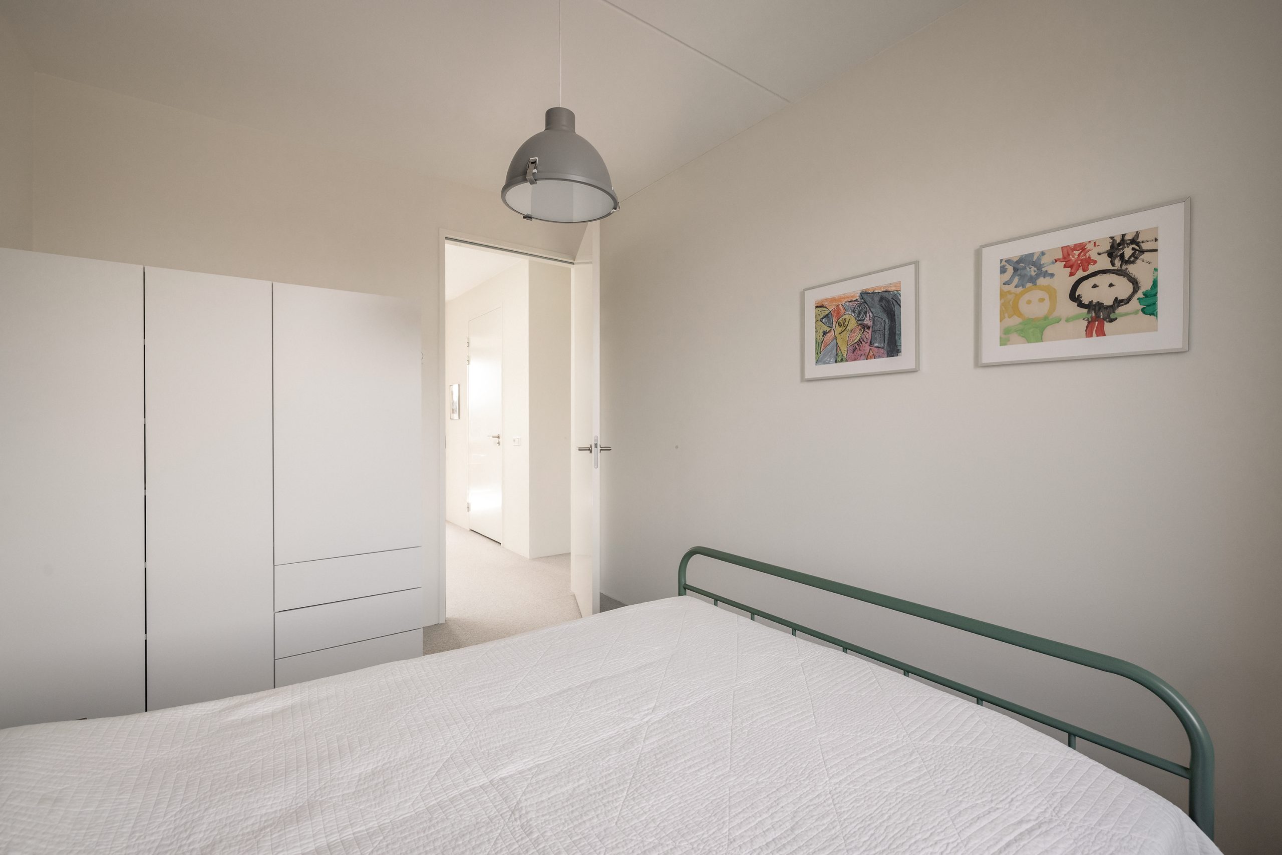 Op de tweede verdieping vind je drie royale slaapkamers, waaronder de master aan de achterzijde met uitzicht op het groene park. De moderne badkamer is een plek om te ontspannen: inloopdouche, wastafelmeubel met verwarmbare spiegel en LED-verlichting. Daarnaast een tweede toilet met fonteintje en een praktische kast met aansluitingen voor wasmachine en droger. Via deze verdieping is ook het dak toegankelijk, inclusief de omvormer van de zonnepanelen.
