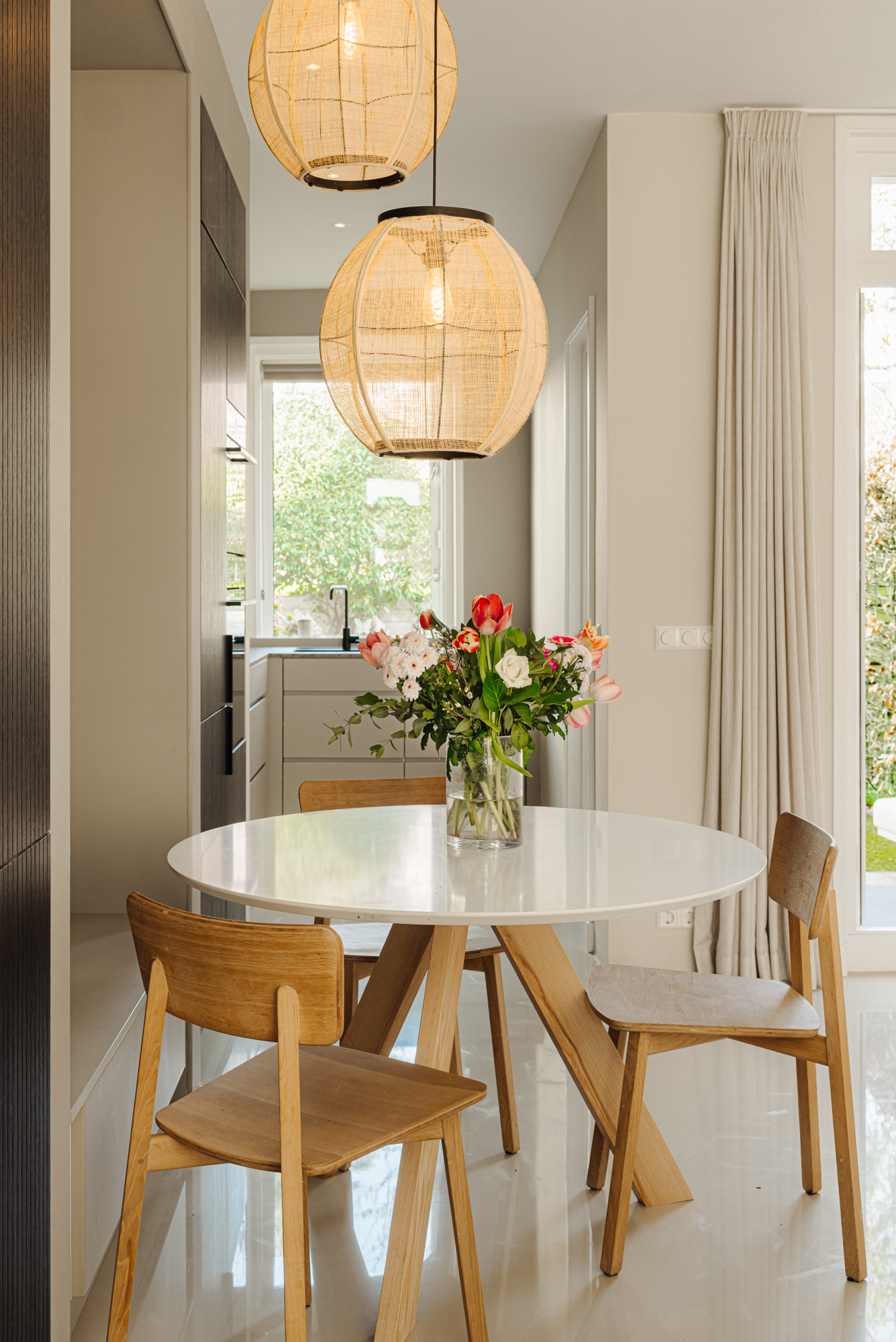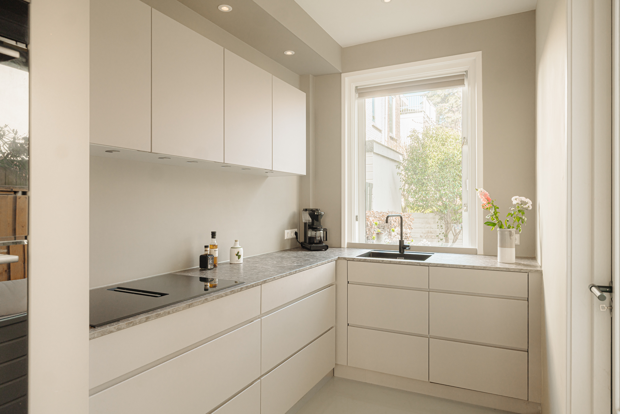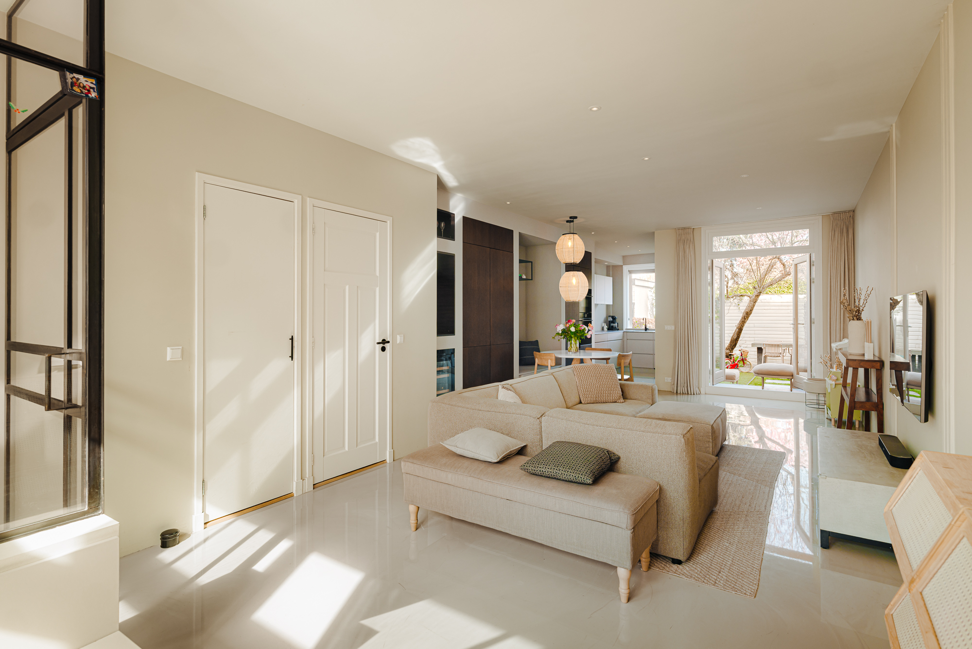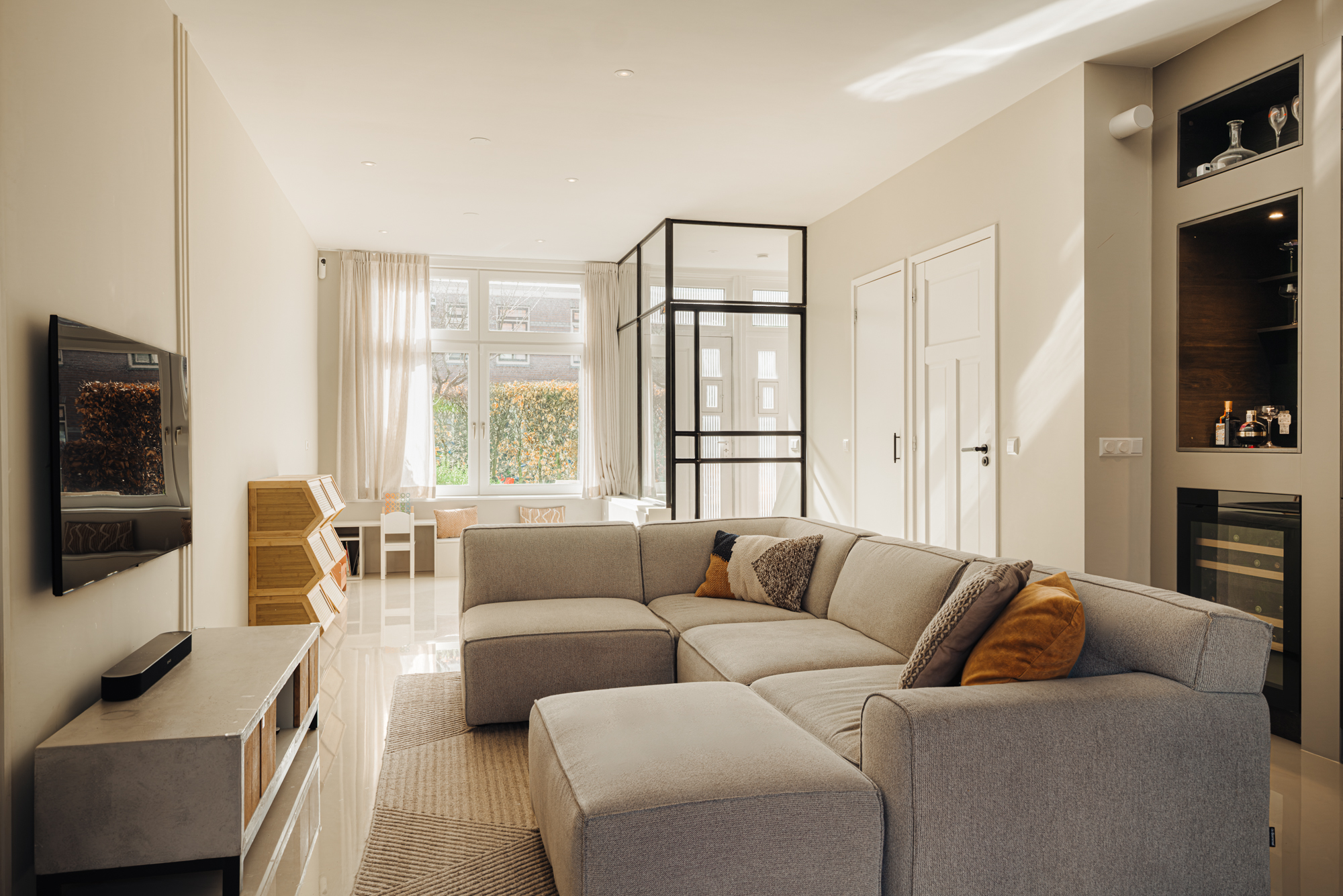 Eenmaal binnen ontvouwt zich een royale leefruimte waarin hoogte, licht en openheid centraal staan. De hoge plafonds en de doordachte indeling creëren een gevoel van rust en ruimte, waarbij het zitgedeelte, eetgedeelte en de keuken op vanzelfsprekende wijze in elkaar overvloeien. De op maat gemaakte keuken in verfijnd Deens design is naadloos geïntegreerd in het geheel en kenmerkt zich door een tot het plafond reikende kastenwand. Deze vormt een strak architectonisch element binnen de ruimte en herbergt hoogwaardige inbouwapparatuur, evenals een subtiel geïntegreerde zitbank bij het eetgedeelte. De keuken is uitgerust met onder andere een 5-pits inductiekookplaat met geïntegreerd afzuigsysteem en een wijnklimaatkast.
