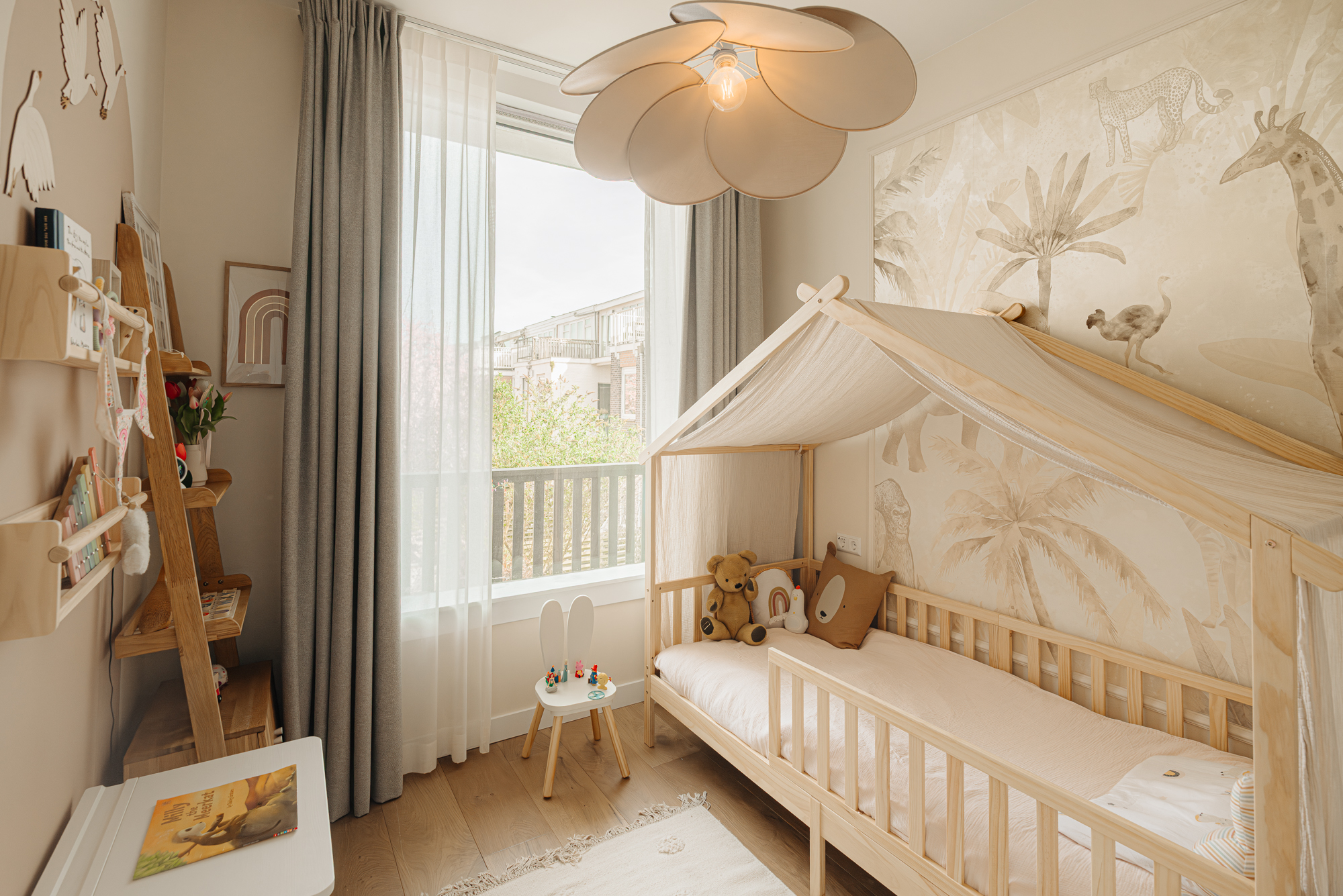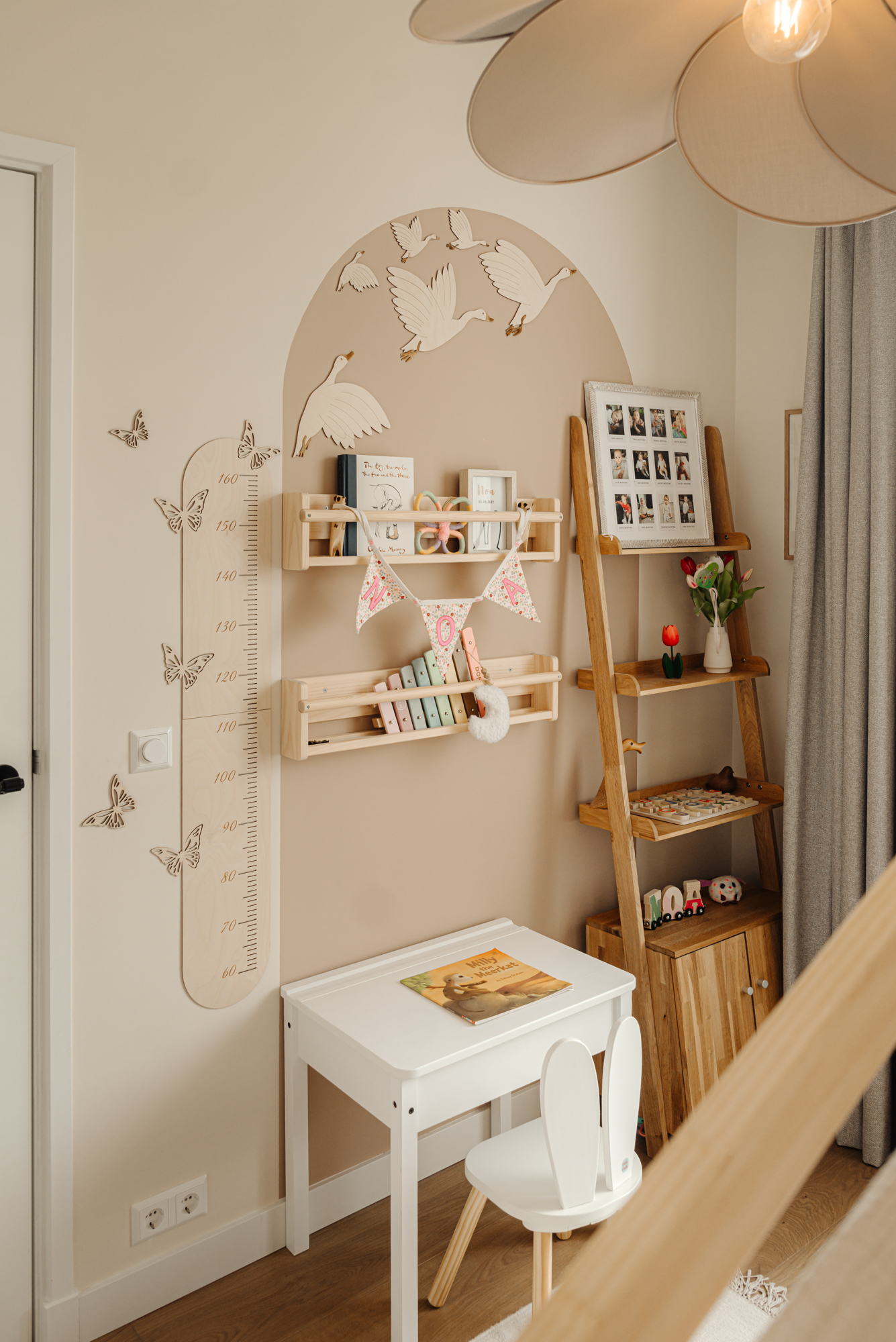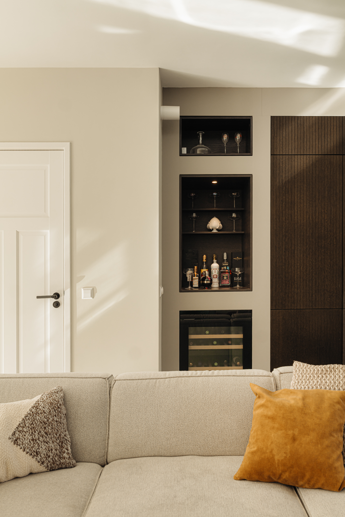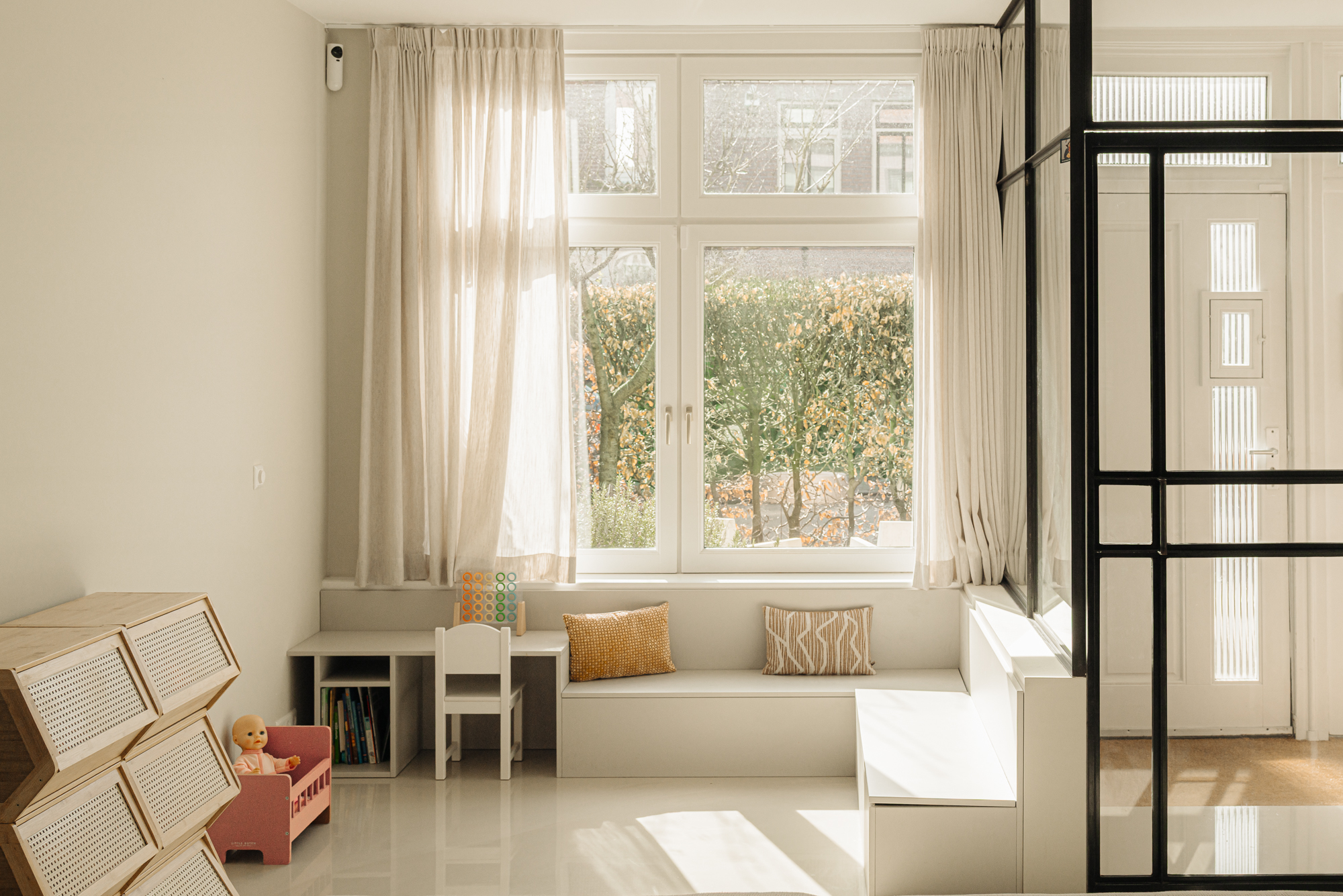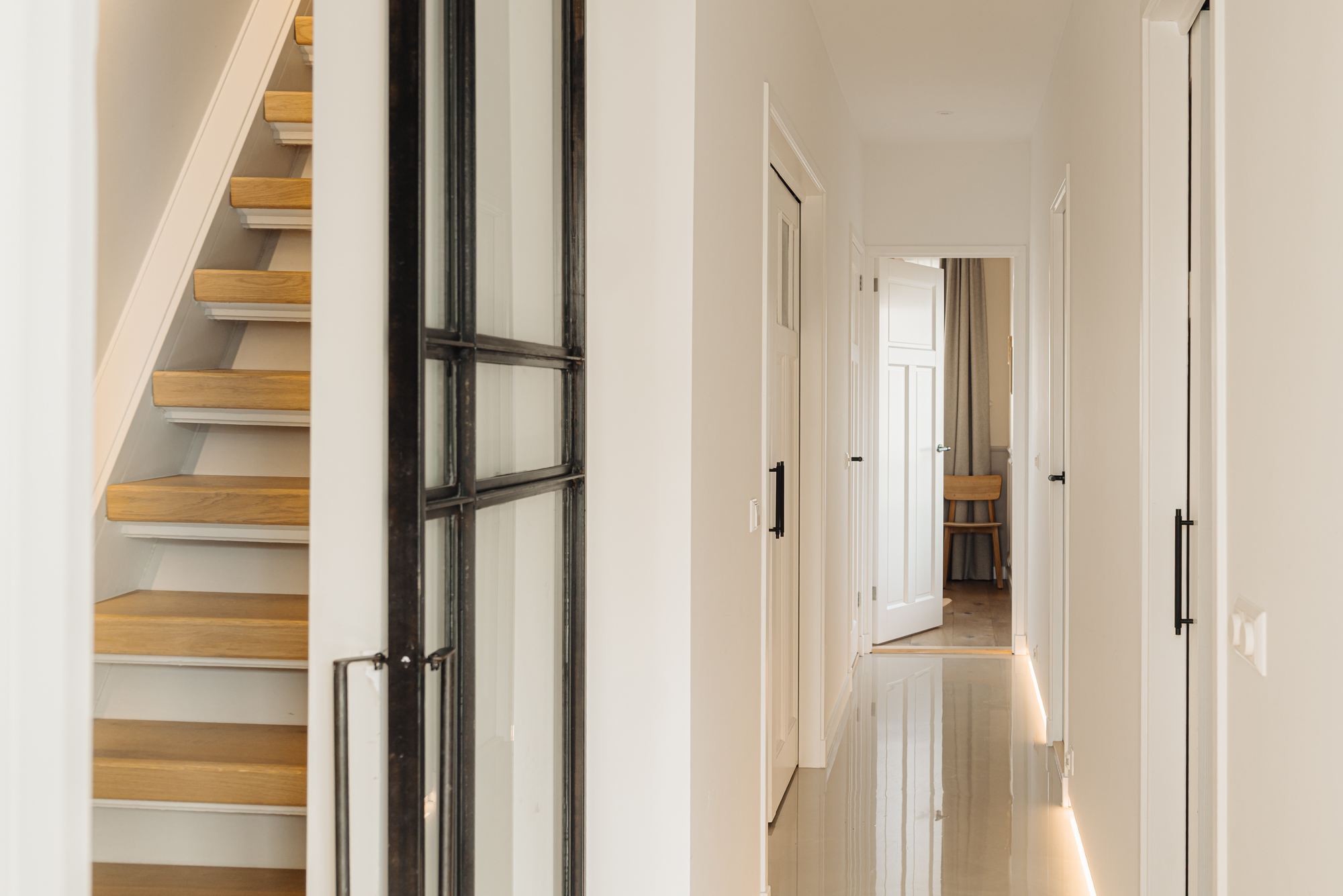 De trap naar de verdiepingen is vormgegeven als een stijlvol geheel, voorzien van subtiel geïntegreerde LED-verlichting die het lijnenspel accentueert en bijdraagt aan de verfijnde sfeer. Daarnaast is op slimme wijze gebruikgemaakt van maatwerkoplossingen, waaronder een geïntegreerde speelhoek met ingebouwde zit- en bergruimte, die perfect aansluit bij het moderne gezinsleven.