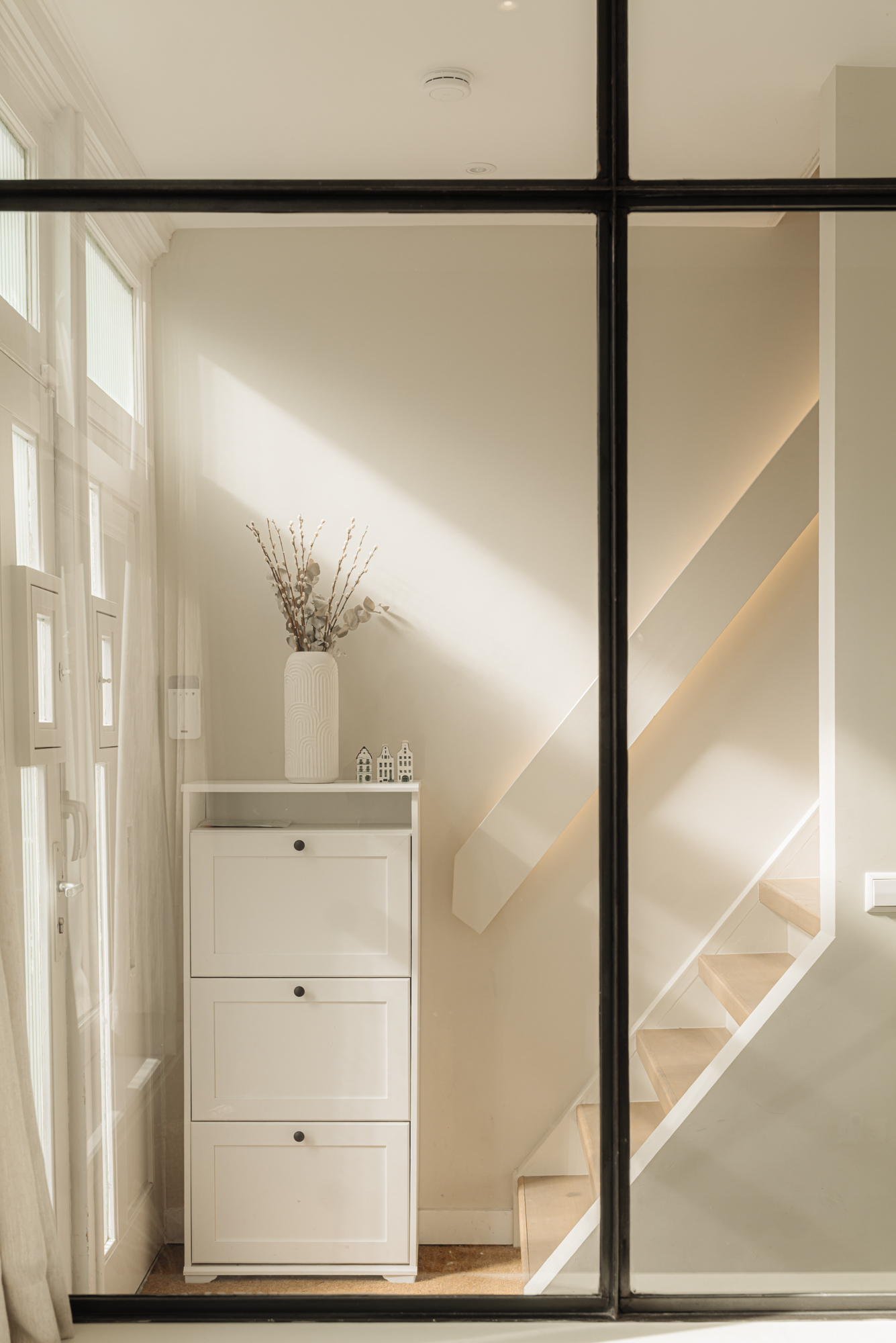 Via de charmante voortuin bereikt u de entree van deze woning, waar direct de toon wordt gezet. De hal staat in open verbinding met de leefruimte middels industriële glazen deuren, die zorgen voor een elegante uitstraling en een rijke lichtinval.