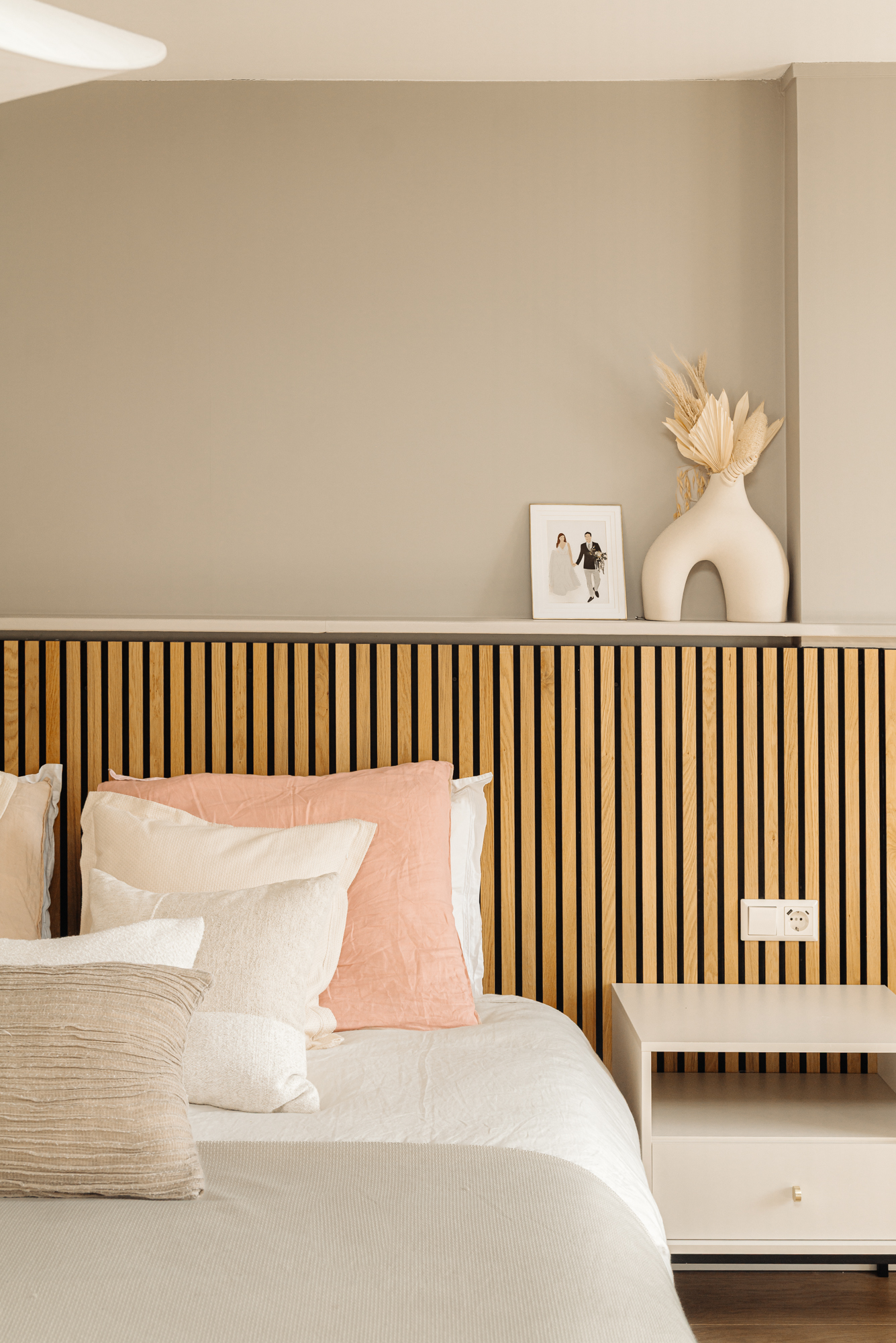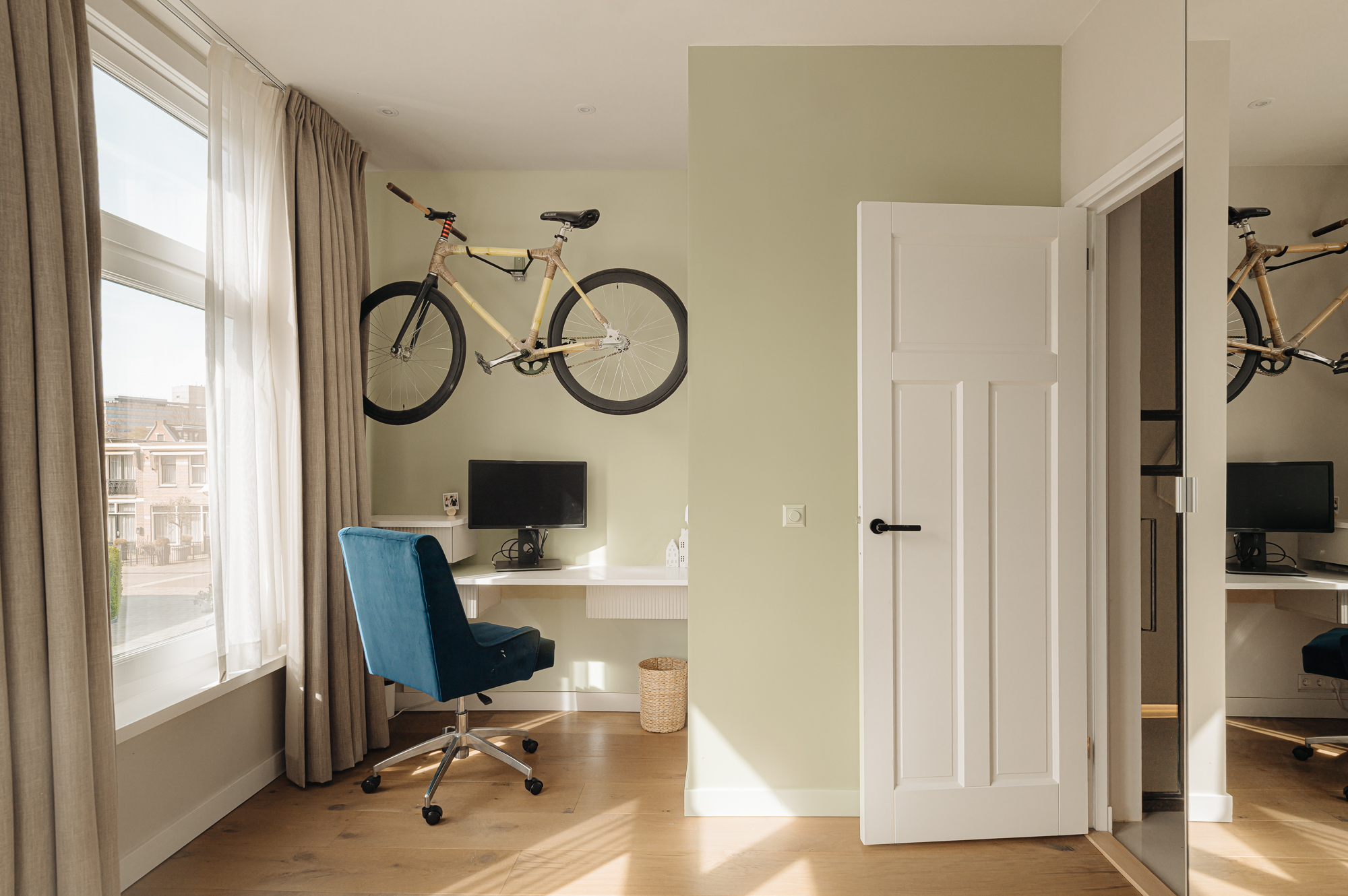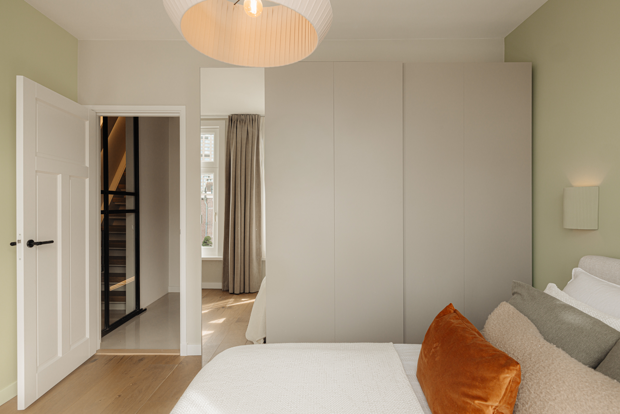 Op de overloop is op doordachte wijze een aparte wasruimte gerealiseerd. Deze is efficiënt weggewerkt achter schuifdeuren, waardoor functionaliteit volledig is geïntegreerd in het ontwerp zonder afbreuk te doen aan de esthetiek.