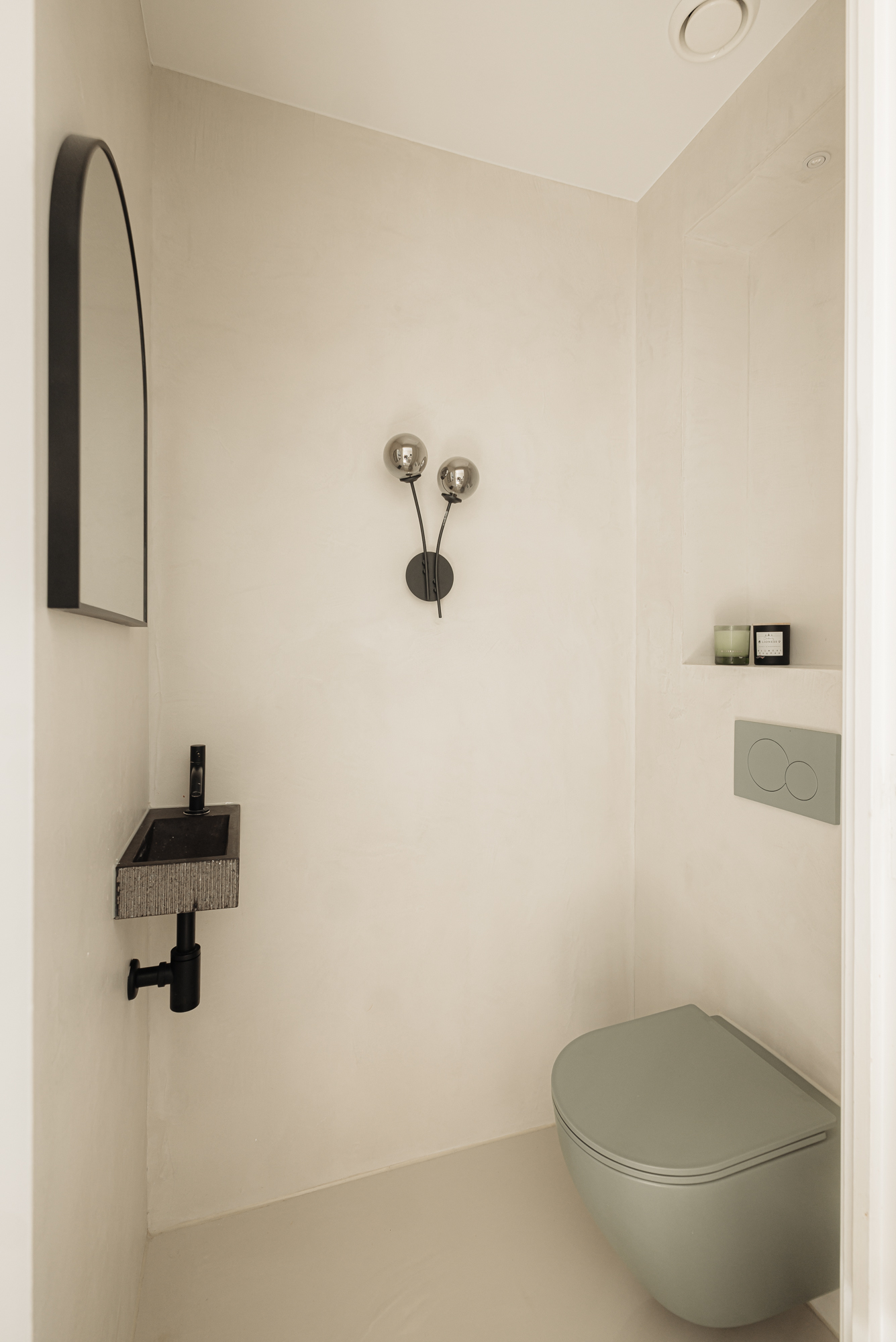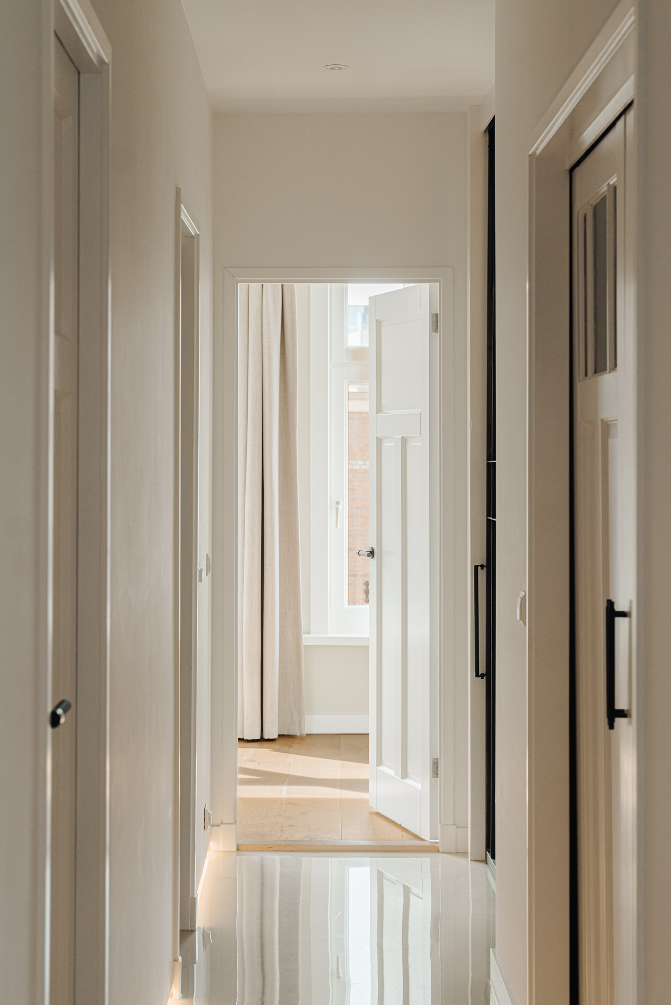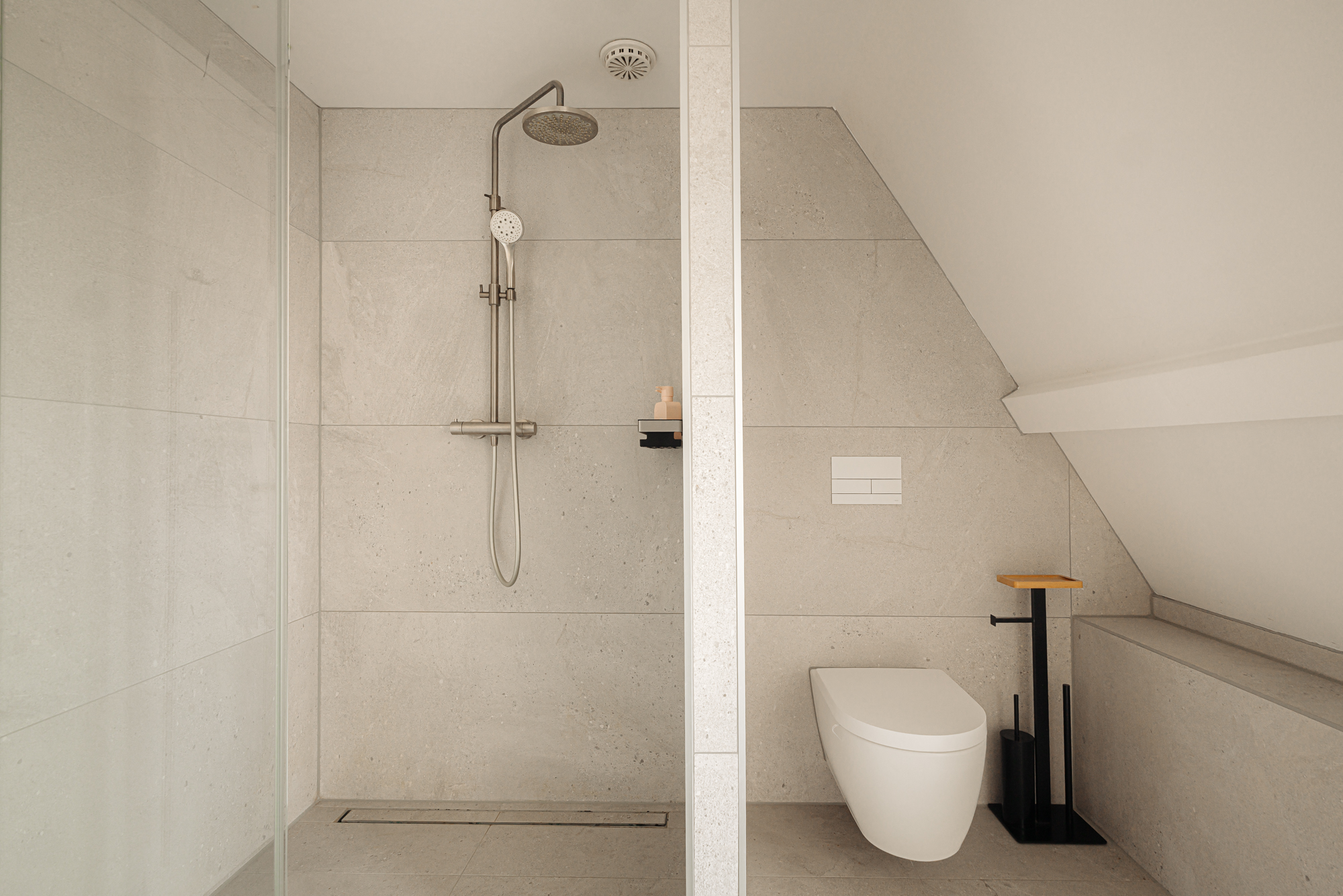 Ook in de afwerking is gekozen voor een consistent en verfijnd materiaal. De begane grond is uitgevoerd met een naadloze epoxy gietvloer terwijl het toilet is afgewerkt in elegant beton ciré. Op de eerste verdieping wordt een warme combinatie van houten vloerdelen en gietvloer toegepast, waarbij zowel de badkamer als het separate toilet eveneens zijn uitgevoerd in beton ciré, strak, tijdloos en luxueus. De tweede verdieping sluit hier naadloos op aan met een hoogwaardige houten vloer, die de serene en exclusieve sfeer van de master suite versterkt.