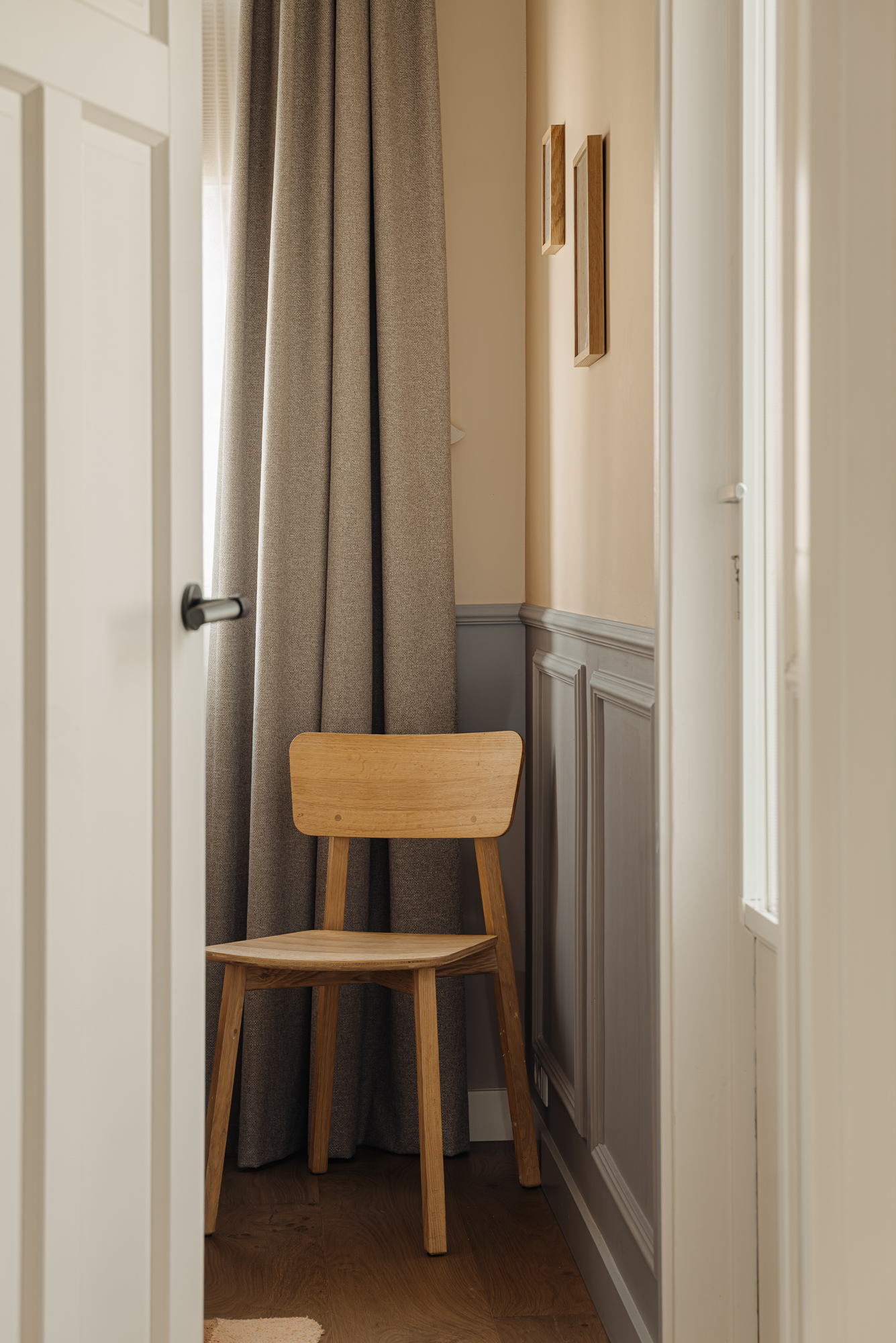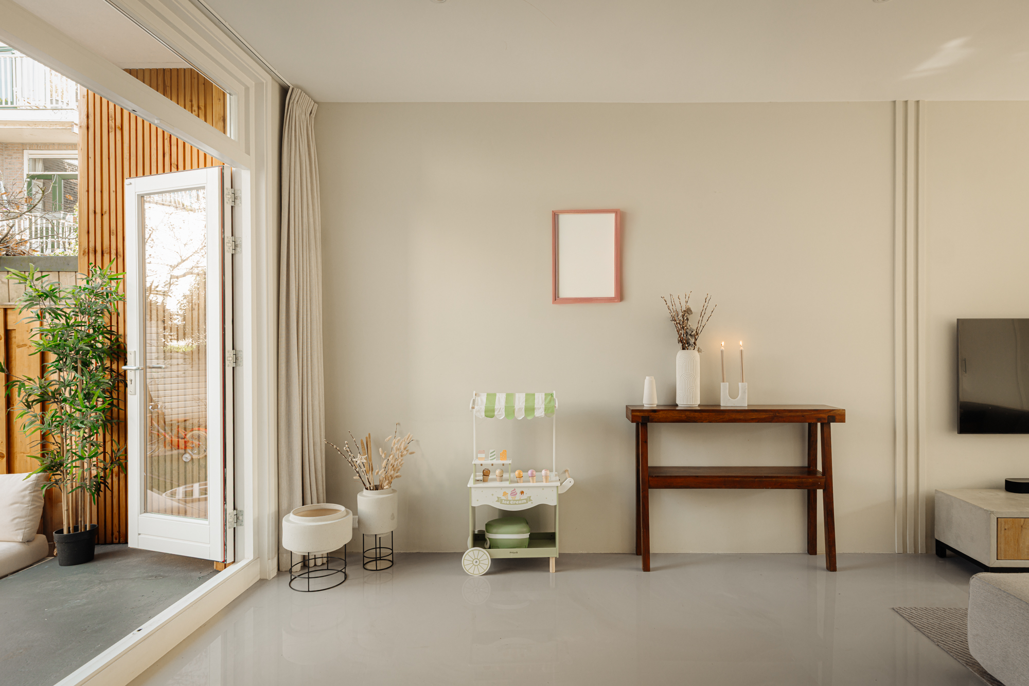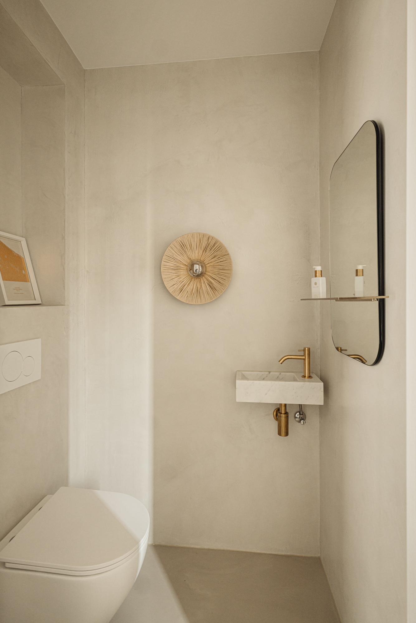 Ook in de afwerking is gekozen voor een consistent en verfijnd materiaal. De begane grond is uitgevoerd met een naadloze epoxy gietvloer terwijl het toilet is afgewerkt in elegant beton ciré. Op de eerste verdieping wordt een warme combinatie van houten vloerdelen en gietvloer toegepast, waarbij zowel de badkamer als het separate toilet eveneens zijn uitgevoerd in beton ciré, strak, tijdloos en luxueus. De tweede verdieping sluit hier naadloos op aan met een hoogwaardige houten vloer, die de serene en exclusieve sfeer van de master suite versterkt.