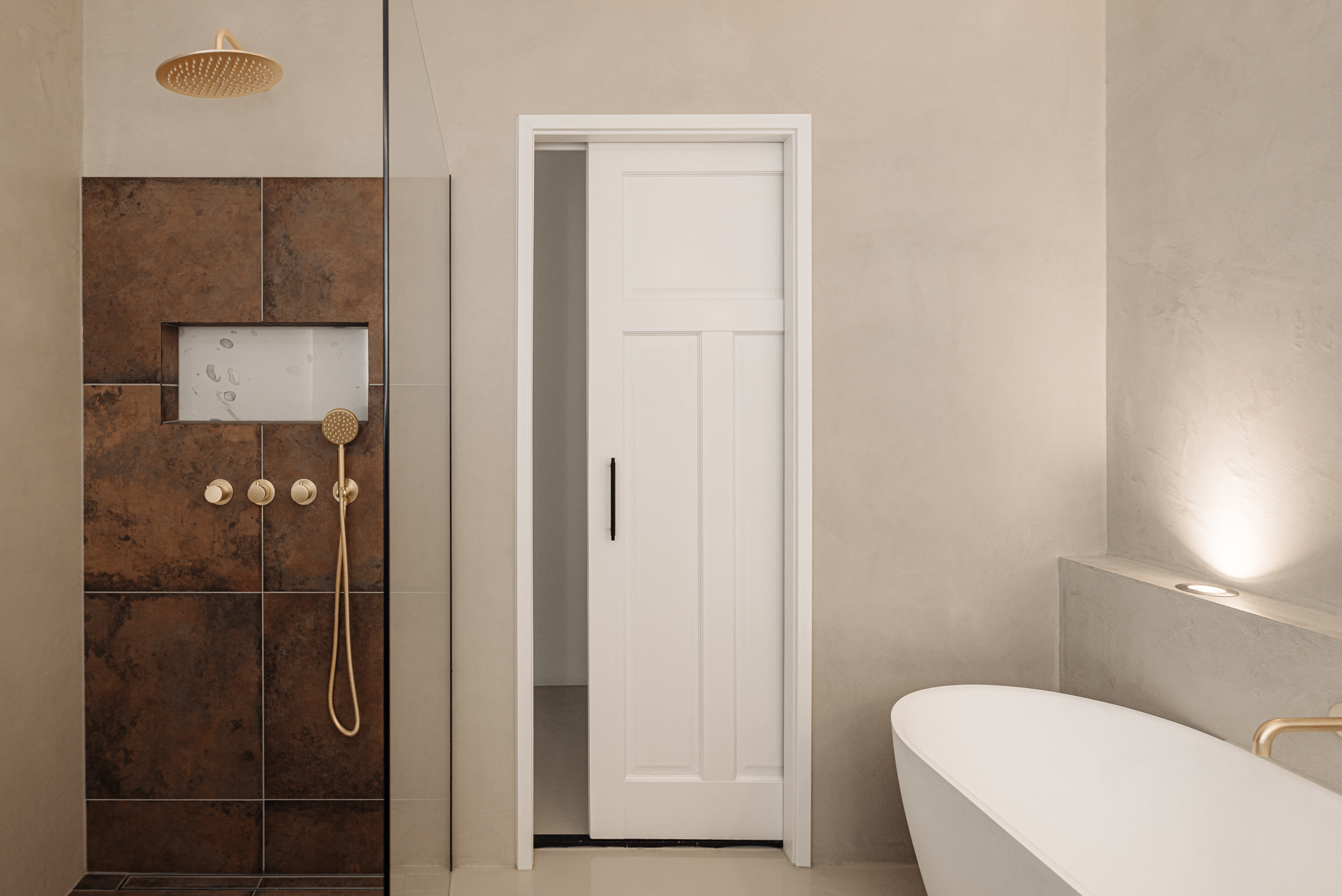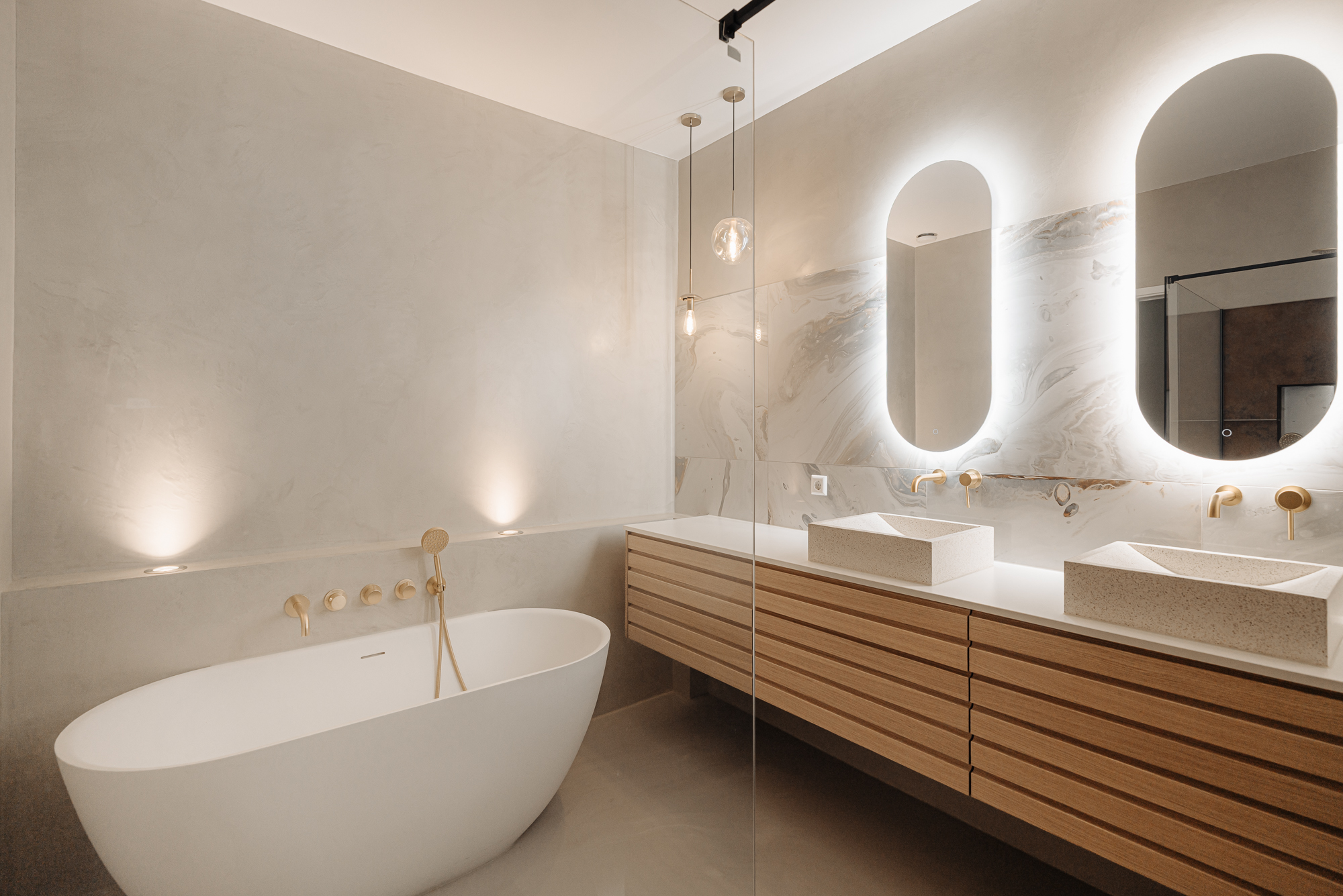 De badkamer is uitgevoerd als een verfijnde met luxe en allure, waar marmer, hout en messing op harmonieuze wijze samenkomen. Dit resulteert in een warme, tijdloze uitstraling met een elegant en hoogwaardig karakter. De ruimte is voorzien van een dubbele wastafel, een vrijstaand ligbad en een royale inloopdouche.