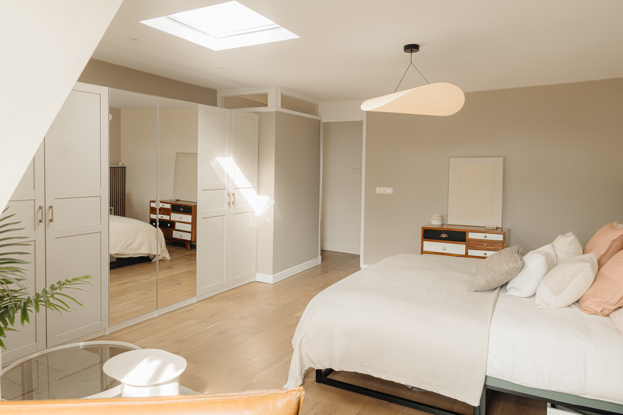 De tweede verdieping is volledig gericht op rust en privacy en ingericht als een volwaardige master suite. Hier bevindt zich een royale hoofdslaapkamer met aangrenzende badkamer en een praktische bergruimte.
